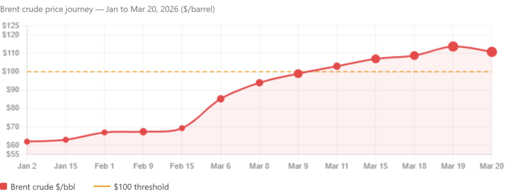 The price trajectory has been breathtaking. Brent had already climbed from $62.18 on January 2 to $85.28 by March 6 — a $23.10 move in nine weeks driven by tightening fundamentals, not just headlines. U.S. Department of the Treasury Then the conflict escalated. By the morning of March 18, Brent was sitting at $108.78 per barrel — roughly $38 more than at the same time last year. Yahoo Finance And on March 19, Brent briefly rose above $119 per barrel before pulling back to $110.80 — still a 3.2% rise from the prior day. Bloomberg