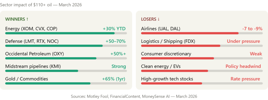 - Winners: Energy majors (XOM, CVX, COP), pure-play E&Ps (OXY, DVN), defense (LMT, RTX), gold, and pipelines