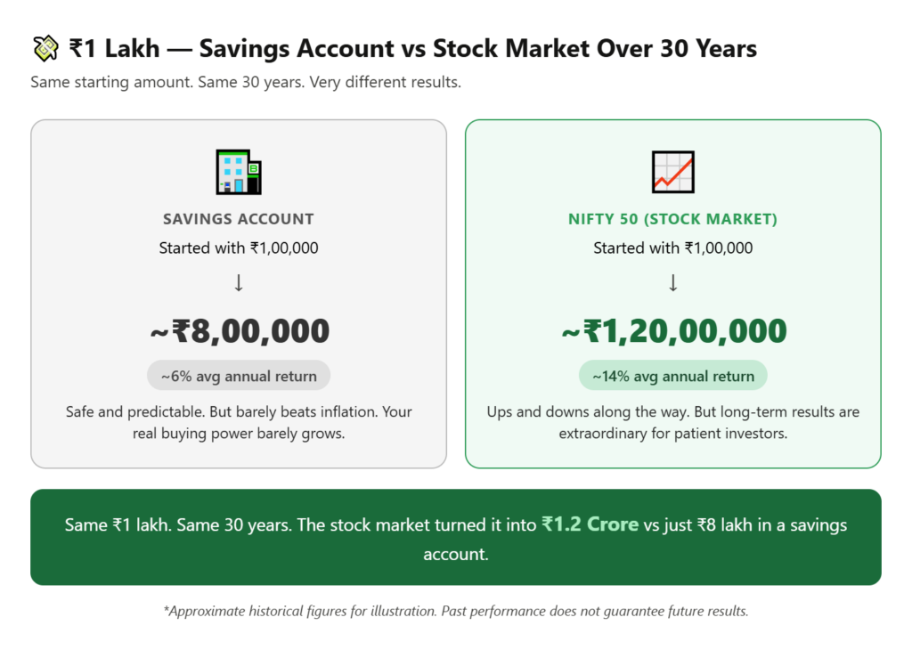 Build Long-Term Wealth The stock market has made more ordinary people wealthy than almost any other investment vehicle in history. ₹1 lakh invested in Infosys during its 1993 IPO would be worth several crores today. The same money in a savings account? Maybe ₹8–10 lakh.