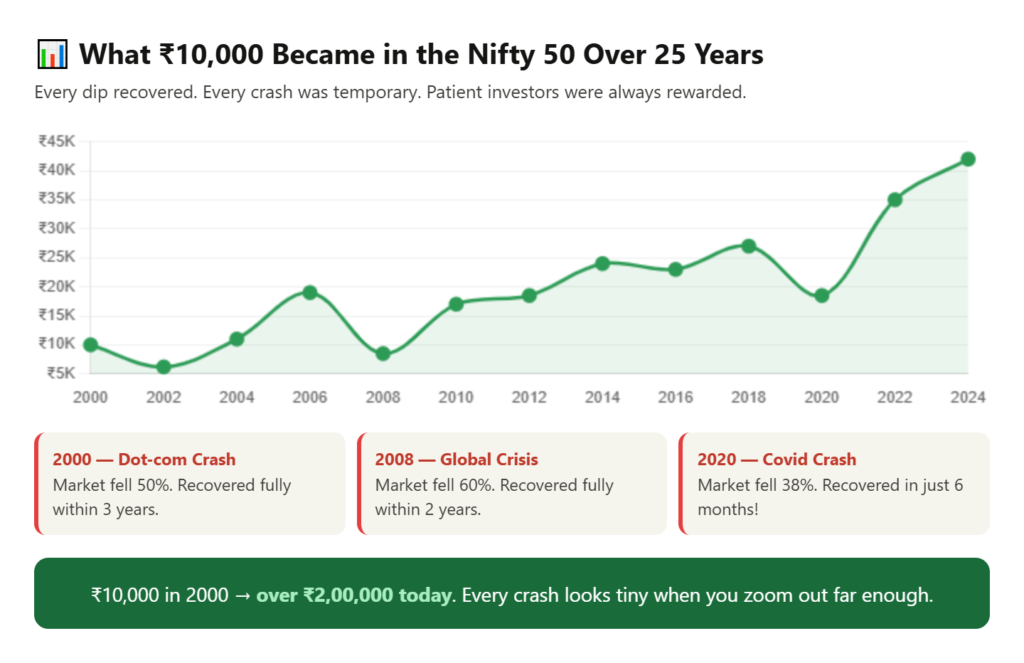 If you had invested ₹10,000 in the Nifty 50 index 25 years ago and just left it there — no checking every day, no panicking during crashes — it would be worth over ₹2,00,000 today.