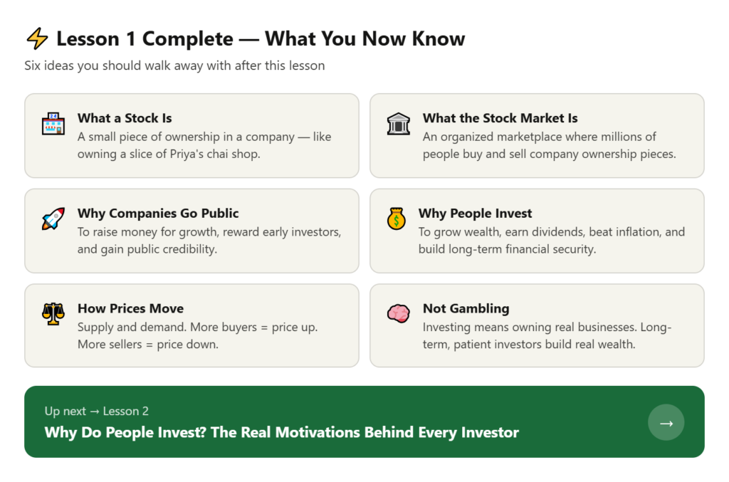 Next Lesson → Lesson 2: Why Do People Invest? (The Real Reasons Behind Every Investor’s Decision)