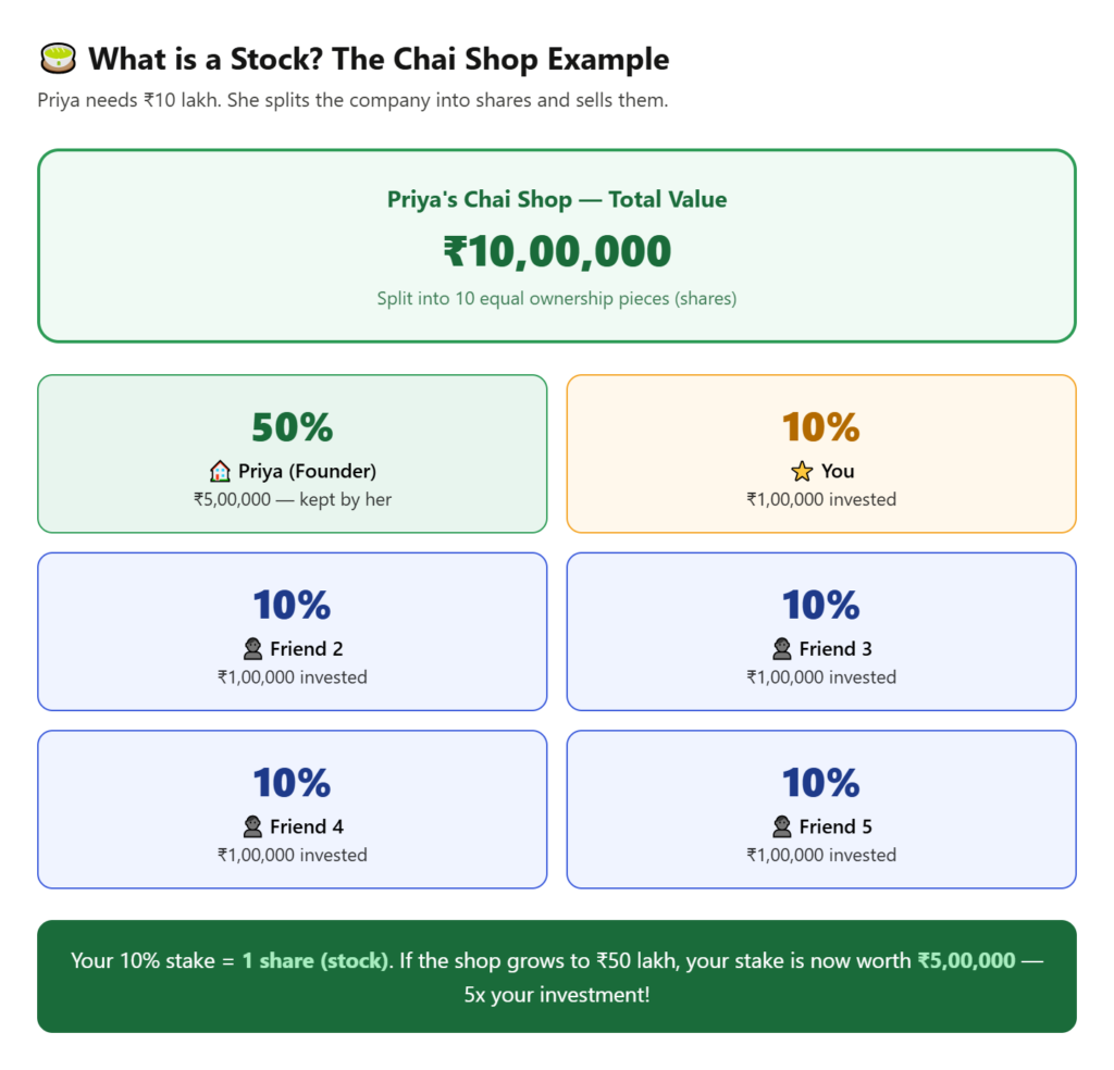 Instead of Priya’s chai shop, think of thousands of companies — Reliance, TCS, HDFC, Apple, Tesla, Amazon — all offering pieces of their business to the public.