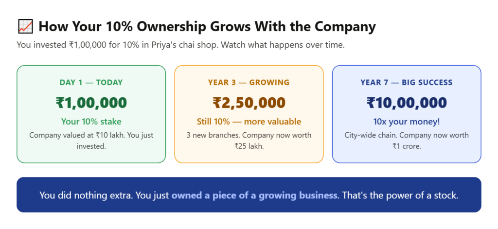 If Priya’s chai shop does well and earns big profits — you earn too. If she opens 10 more branches and the business becomes very valuable — your 10% ownership becomes worth much more than your original ₹1 lakh.