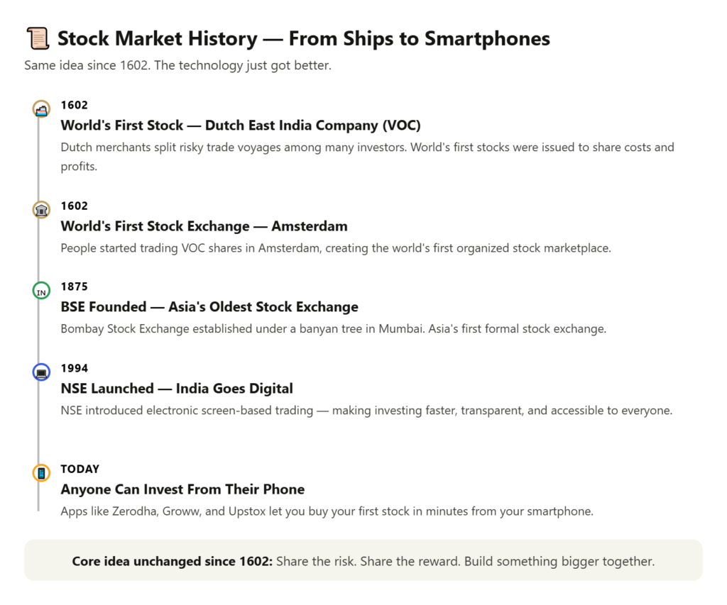 Don’t worry. By the end of this lesson, you’ll understand exactly what the stock market is, why it exists, and why millions of people use it to build wealth. No confusing jargon. No prior knowledge needed. We start from zero.